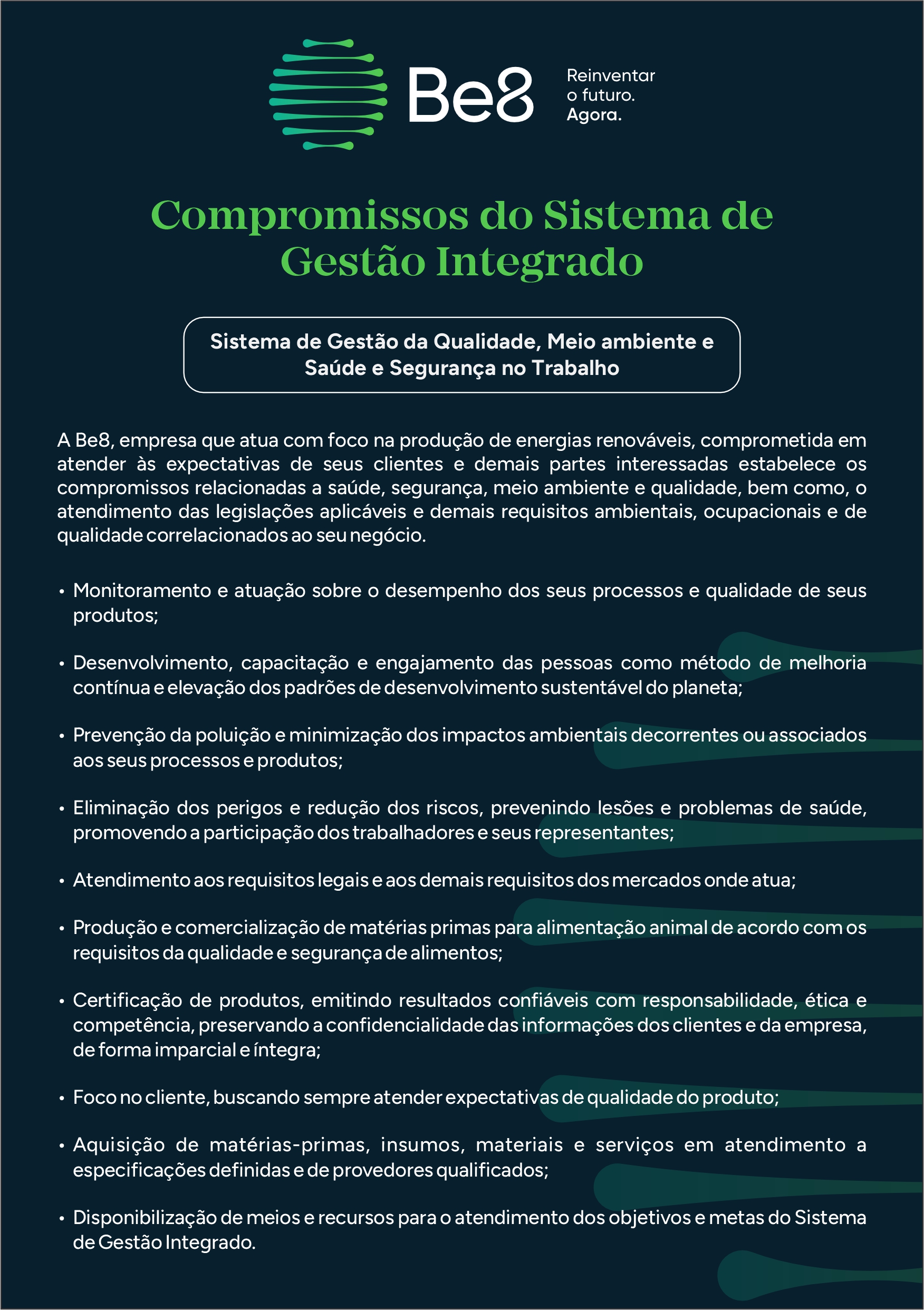 Le champ d'application du Système de Gestion de la Santé et de la Sécurité de l'Environnement et du Travail, pour l'unité Be8, située à Marialva/PR, s'applique à la fabrication de biodiesel opérant dans la chaîne agro-industrielle.