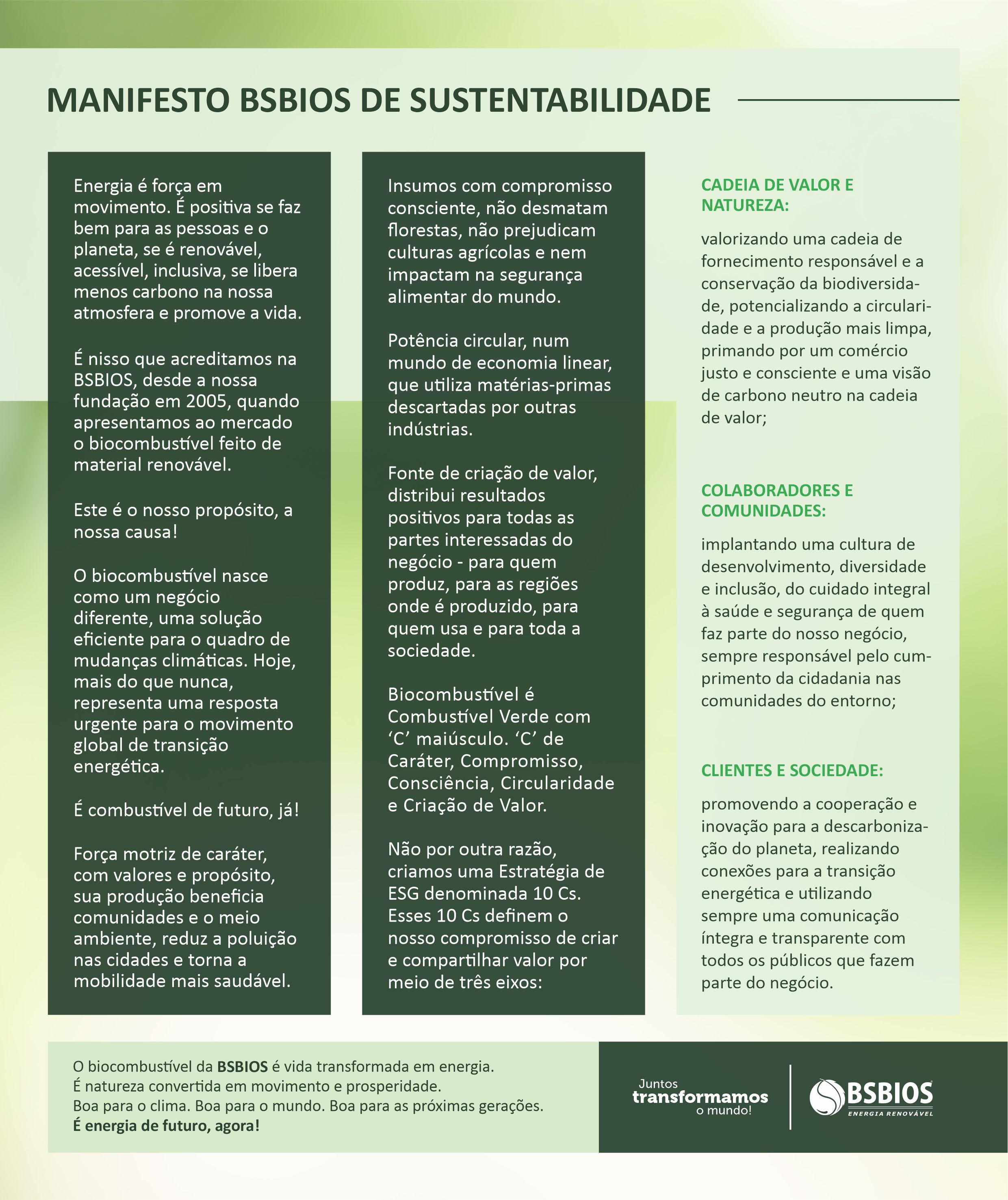 En 2017, BSBIOS a commencé à publier le rapport de développement durable, basé sur la méthodologie internationale Global Report Initiative – GRI, de manière engageante, par l'intermédiaire de ses employés, de ses parties prenantes et des consultants de la Fundação Instituto de Pesquisas Econômicas – FIPE.