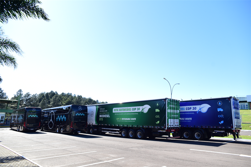 Do Sul ao Norte do Brasil, quatro veículos Mercedes-Benz – dois caminhões Actros 2553 S 6x2 (motor OM471) e dois ônibus O500RSDD (motor OM460) – vão percorrer mais de 4.000 quilômetros começando na unidade da Be8 em Passo Fundo (RS), até chegar em Belém (PA), sede da 30ª Conferência das Partes da Convenção-Quadro das Nações Unidas sobre Mudança do Clima (COP 30), no dia 5 de novembro.